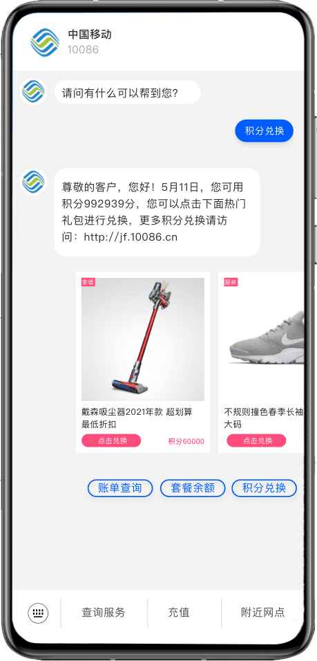创新提出应用号服务,短信界面内可以服务交互,无需跳转
